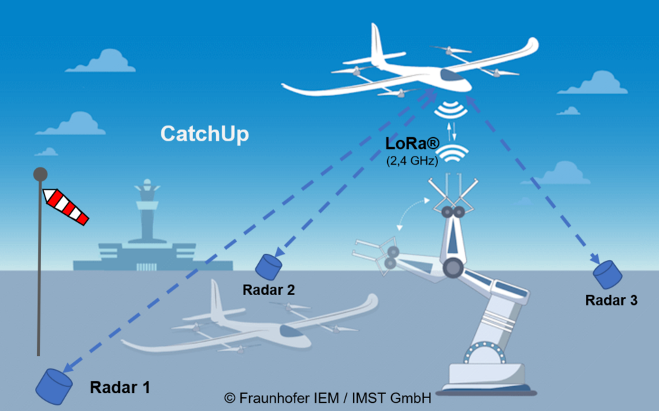 An active ground system will grab the aircraft out of the air and prepare it for further ground processes. The aim is to significantly speed up the landing process and improve positional accuracy. The essential basis here is the collection and low-latency exchange of position and environmental measurement data between the aircraft and the ground station.